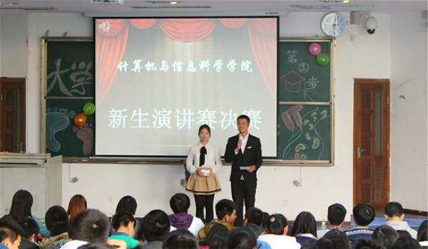 2014年11月27日15时许,以“迈好大学第一步,走好成功人生路”为主题的新生演讲决赛在弘德楼5105隆重举行。本次比赛由14级计科1班班长和14级信管班长担任主持人。到场的评委及嘉宾有新濠峰娱乐