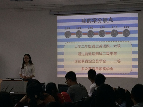 据悉,答辩分为候选人PPT展示、评委提问两个环节,采取百分制打分,总和所有评委打分分高者获得国家助学金,现场计分、现场公布结果。答辩会上,14名候选人通过精心准备的PPT展示了各自在思想品德、学习成绩、社团活动、竞技竞赛等方面取得的突出成绩,评审小组成员认真听取了候选人的竞选演说,并据候选人情况进行了有针对性的提问。
