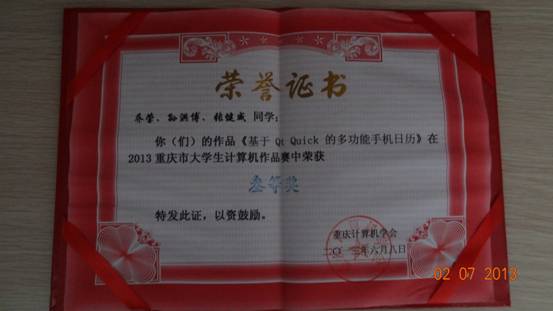 2013年重庆市大学生计算机作品赛于2013年6月8日在西南大学拉开帷幕。本次大赛分两个阶段进行:初赛和决赛。初赛由各大高校内举行,经过激烈的角逐,新濠峰娱乐 选拔出最优秀的参赛作品2项,分别是“基于Qt Quick的多功能手机日历”和“一卷通智能助手”。从初赛到决赛,新濠峰娱乐 给予赛前培训、实验室安排、交通补贴等支持。