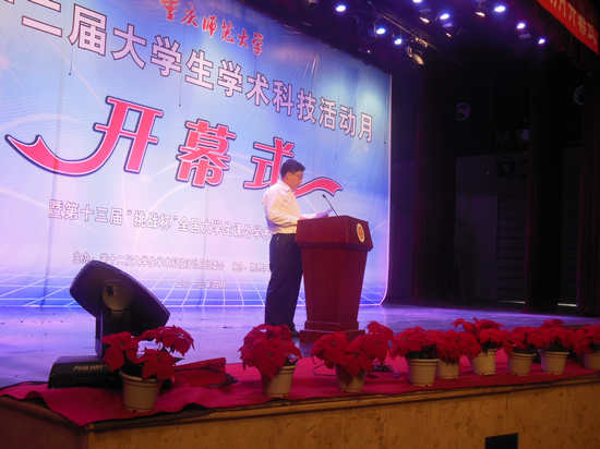 为进一步营造浓厚的校园科技创新和学术研讨氛围,引导广大青年学生崇尚科学、追求真知,培养同学们理论联系实际的学术作风、认真严谨的治学态度和坚持不懈的钻研精神。我校特于2013年4月25日下午2:30在校友会堂举办了第十二届大学生学术科技活动月开幕式暨第十三届“挑战杯”全国大学生课外学术科技作品展活动。出席本次活动的领导有孔春阳副校长,党委宣传部、教务处、学生处、科研处、研究生处、校团委等部门领导,各新濠峰娱乐