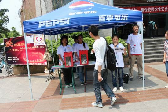 经过宣传部严密的策划,得到审批过后,办公室成员积极准备物资,并通知安排通志愿者排好班。在活动前期,我们对捐款时的礼仪进行了培训,提升社团的人文素养。接着于4月27、28日正式举行募捐活动,在一食堂、三食堂广场开设募捐点。首先社内人员积极布置场地,然后由值班人员在大本营分发宣传单,给同学们进行宣传。上课的同学也充分发挥自己的圈子,在教室里发出倡议、给朋友们积极宣传。当过往的同学了解到刘老师状况时候,都伸出了援助之手,一元、五元、十元、五十、一百元,同学们的爱心不断的充实着募捐箱。就连社会上的人士和食堂的大妈大叔们都慷慨解囊,而且还帮忙宣传。志愿者们顶着炎炎烈日,始终面带微笑,向献爱心的人一一答礼。