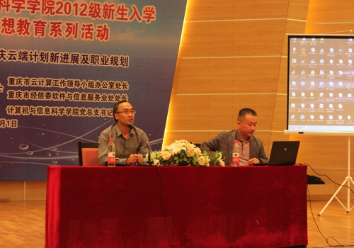 邀请到重庆市云计算工作领导小组办公室处长、重庆市经信委软件与信息服务业处处长居琰博士,于2012年11月1日下午2:30在校友会堂音乐厅为2012级全体新生开展了“重庆云端计划新发展及职业规划”的主题报告。院学工办和2012级辅导员参与报告大会,报告会由新濠峰娱乐