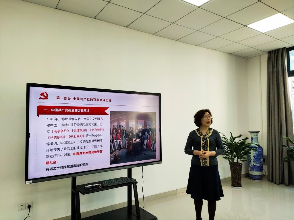 党委书记陈兰同志与会同志领学,从我党诞生的历史背景、党的光辉历程和三大转折事件向与会成员讲述中国共产党的百年奋斗历程,并通过生动形象的视频,展示了国家在经济、文化、科学、军事等方面在世界排名的变化,学习党的伟大历史贡献。陈兰书记领学让大家更加深刻认识红色政权是从哪里来的,中国共产党、新中国和社会主义的来之不易以及中国共产党在百年奋斗中积累的宝贵经验和伟大精神。