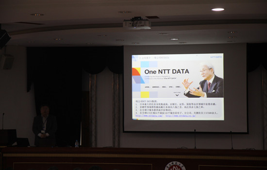 宣讲会上,周室长首先向大家介绍了NTTDATA的公司概况、公司简介、公司发展史、公司组织结构、公司主要业务领域等。他谈到,NTTDATE集团是日本最大的信息系统集成商,在银行、证券、保险等众多领域中业绩卓越,在世界500强企业中居第31位,目前已有四个子公司,中国总部位于北京。重庆分公司于2011年4月成立,现有员工80余人,并将于2013年招聘100名面向日本的软件外包研发人员。